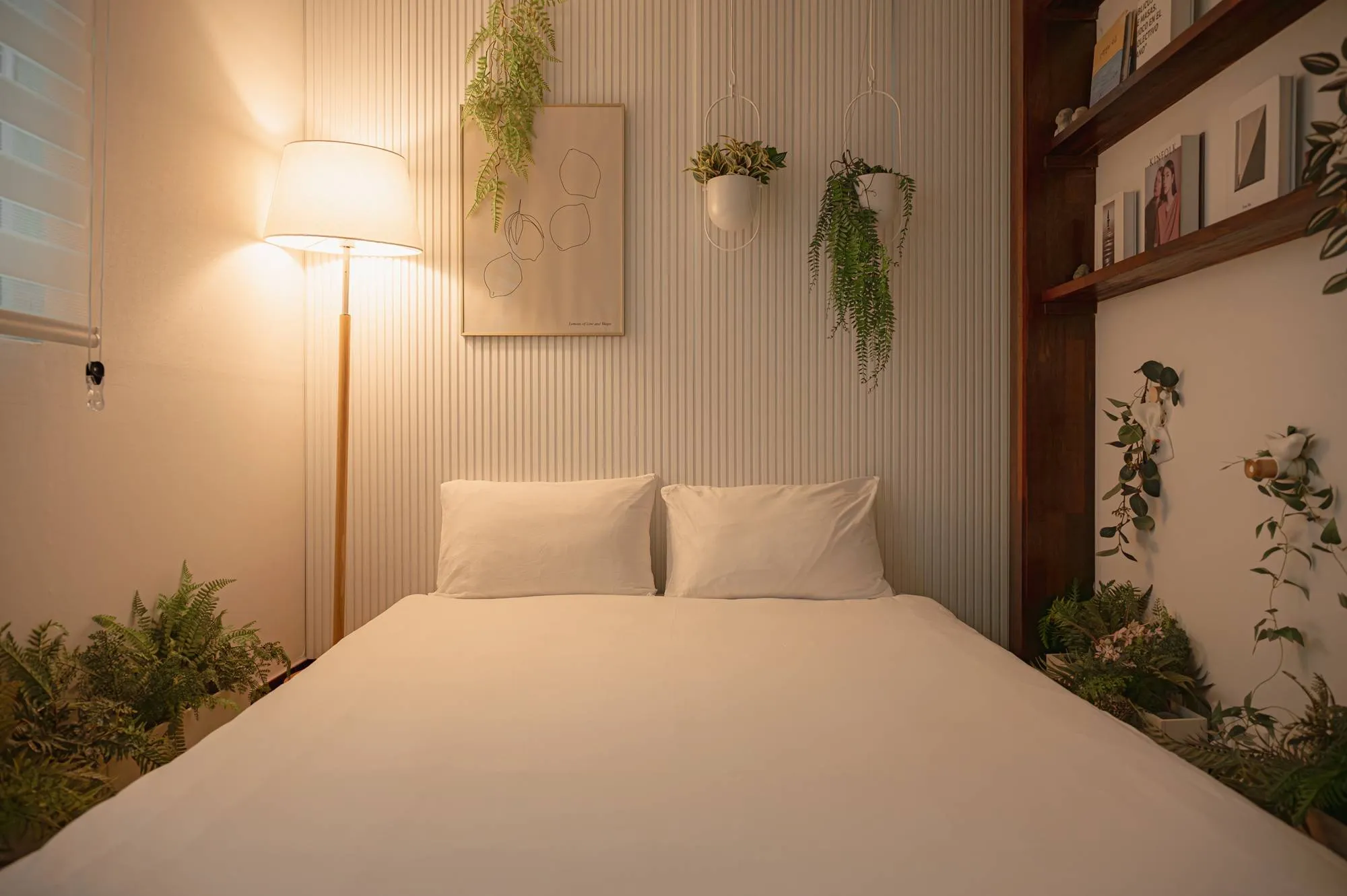 這間溫馨的客房配有舒適的雙人床 (Queen Bed)、精選書籍,以及能撫慰心靈的**「植感設計 (Planterior)」**風格。